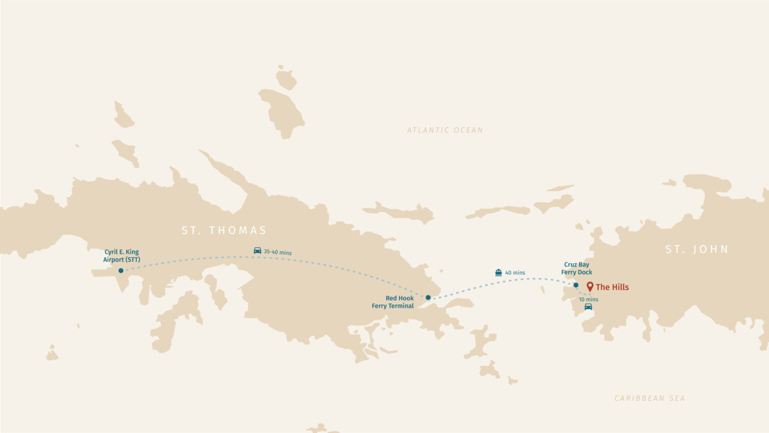 Once you arrive on St. Thomas, you have several options to continue to The Hills. The most common option is to take a taxi to Red Hook and board the hourly ferry to Cruz Bay, St. John.