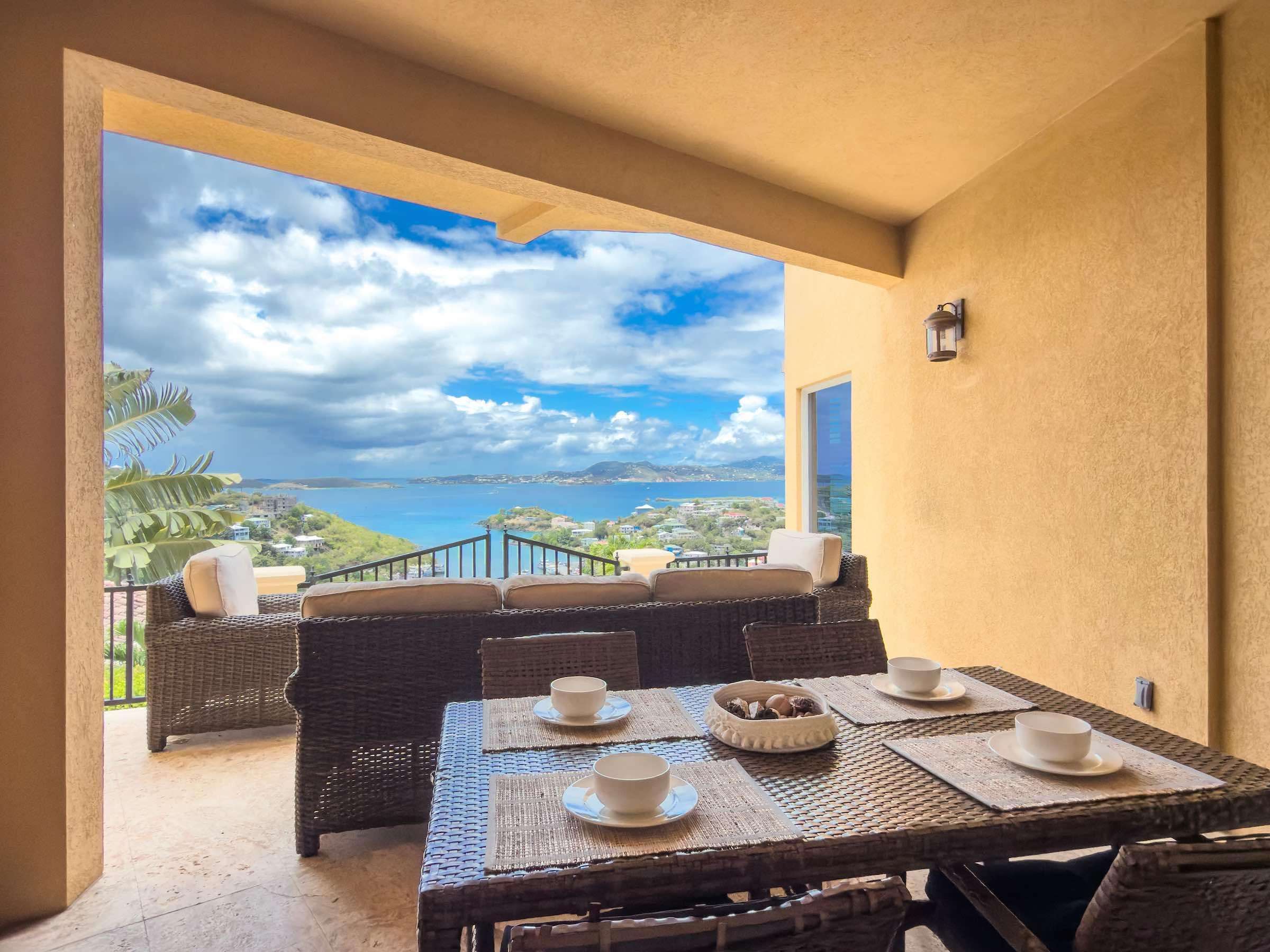 You’ll be greeted with panoramic views of neighboring islands and sapphire-blue waters surrounding St. John. The chirping of song birds and the wind dancing through the palms will instantly transport you miles away from the ordinary, towards paradise.