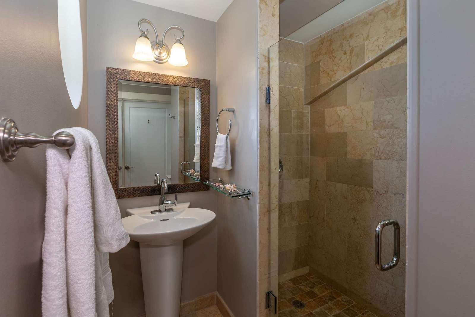 Step outside to one of two covered balconies, where you will find spacious entertaining spaces including a large patio table with seating for eight, comfortable casual seating, and a gas grill, perfect for al fresco dining. The outdoor spaces are ideal for enjoying your morning coffee while watching boats traverse the ocean or perhaps catching a rainbow.