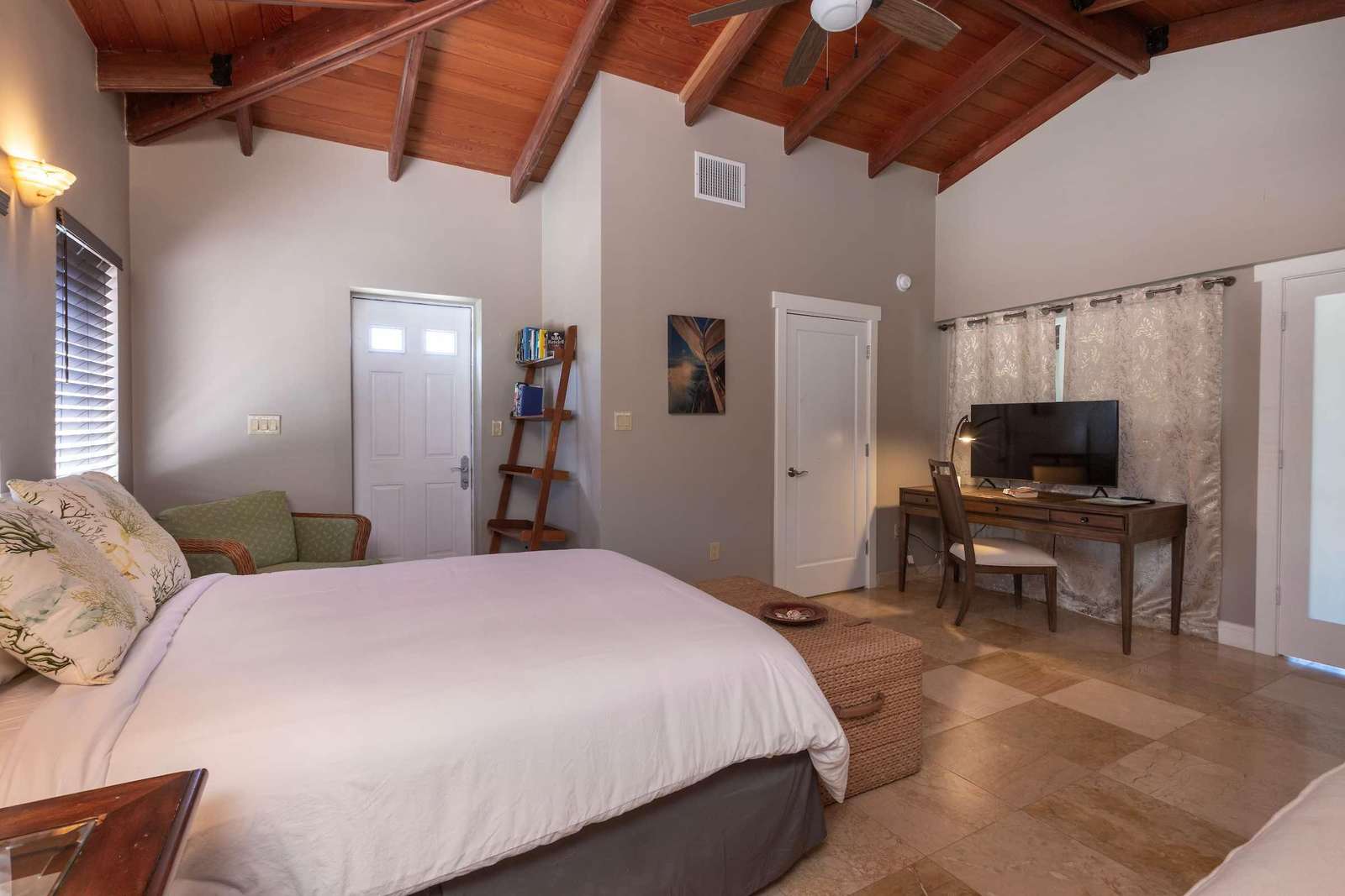 The fourth bedroom is located upstairs and features its own private entrance via a box staircase. This room offers a queen bed, a full en-suite bathroom, and a dedicated desk, making it ideal for remote work or added privacy.